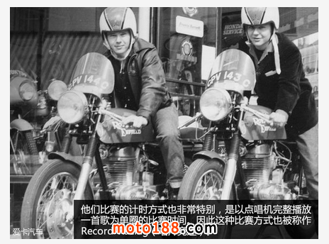 Café Racer起初是嘲諷那些在Ace Cafe門口競速的年輕人,反叛且激進的他們對速度有著近乎瘋狂的渴望,加之對于搖滾樂的熱愛,讓競速比賽與點唱機巧妙結合。他們從餐吧的門口出發(fā),以點唱機完整播放一首歌曲的時間為準,最先回到起點的車手獲得勝利。這種方式也被稱作為Record-Racing(唱片競速)。