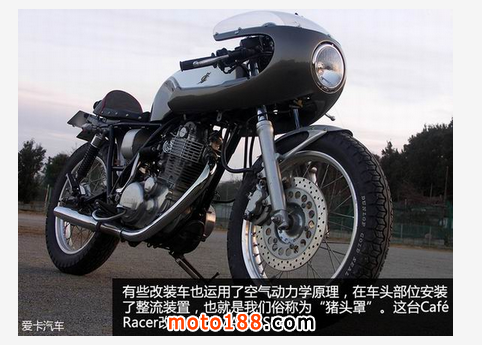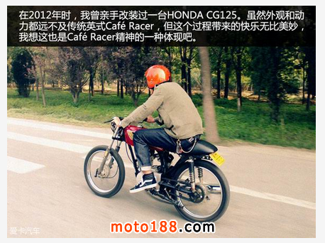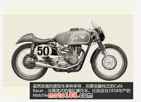 現(xiàn)在看來平白無奇,但在當時,這樣的一個稱號可以說是“無上的榮耀”。所以為了它,眾多愛好者開始對自己的愛車進行重度改裝,以得到更快的速度。那些退伍士兵的機械知識則得到充分發(fā)揮。在不斷摸索以及GP比賽的啟示下,他們認為將車把設計成分離式,油箱形狀細長且兩側帶有凹槽(讓膝蓋可以緊貼油箱)的形式最為出色。