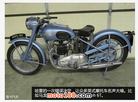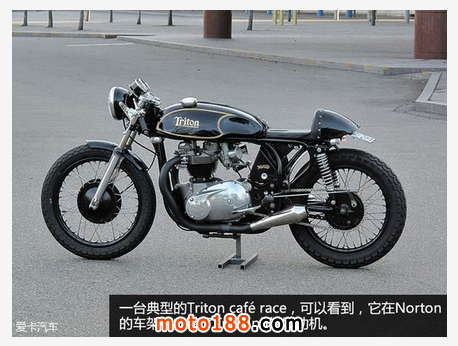 此外,有些比賽選手會將兩臺不同品牌的摩托車整合到一起。比如,他們會把Triumph的發(fā)動機,安裝到Norton或者BSA的車架中?;虬袾orton發(fā)動機安裝到Vincent中。因此出現(xiàn)了一些如Triton、Tribsa、Norvin等奇怪的稱謂,其實是把兩個摩托車品牌的部分字母拼湊在一起,以彰顯這臺車的身份。要知道,能做到這點的人,是要有一定經濟實力的。