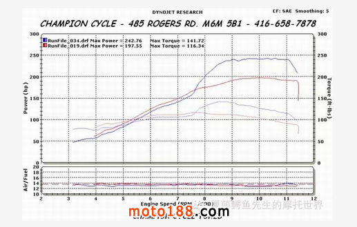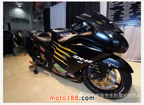 除了這個瘋狂的Muzzy氮氣套件,老爺子車上的其它部分的改裝也是偏重于性能。Muzzy鈦合金-碳纖維 4-1-2的全段排氣系統(tǒng),Dynojet的電腦+Auto tune套件,Dynojet全時調(diào)節(jié)LCD屏幕,BST碳纖維輪轂,快速換擋。在爆改完畢之后,這輛瘋狂的”旅行車“輪上動力接近250hp,相當(dāng)于一輛MOTOGP戰(zhàn)車,2秒破百,5檔就可以拉到320千米/小時的時速!