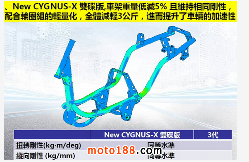 精心的改良增強(qiáng)了這新型號(hào)的起步加速和超車加速性能,但CYGNUS-X雙碟版很巧妙地以新增後碟煞所提升的制動(dòng) 力來(lái)平衡增強(qiáng)了的扭力和加速性能,且將前後煞車比例設(shè)定為兼顧安全性與運(yùn)動(dòng)性的7:3,來(lái)提升操控之安全。