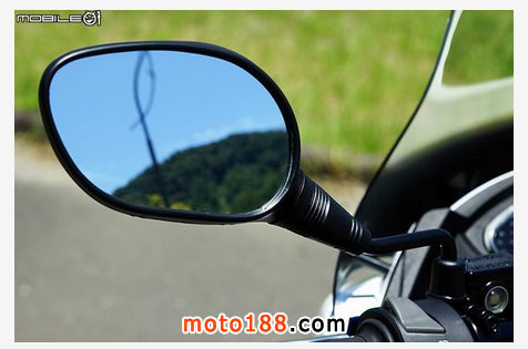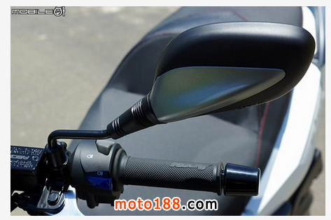 后照鏡正面及背面部分,采用外調(diào)式后照鏡,鏡骨角度較為奇特一些,估計是為了讓后照鏡能閃過肩膀,才能看清后方,不過這樣的鏡骨也會稍微干涉到把手開關(guān)按鈕操作就是。