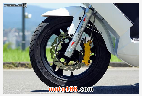 前輪為 MAXXIS 生產(chǎn)的 iPro 系列輪胎,規(guī)格為 120/80-14,胎紋可以參考右側(cè),這條輪胎在許多大羊車款都做為原廠配胎,抓地力還不錯,但耐用度差強人意。
