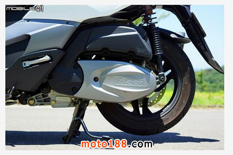 引擎的右側(cè)部分,這邊與 Elite 300i 差異不大,也是配置超長的排氣管前段與尾段,另外也可以看到 Elite 300E 的后碟盤之大。