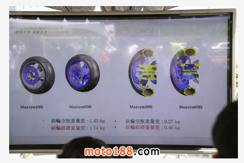 輪框部分雖然延續(xù)前15寸後14寸的設(shè)計,但是這次輪框使用新技術(shù)進(jìn)行輕量化,在不犧牲剛性的情況下前後輪都進(jìn)行減重,大量挖空設(shè)計省下了不少重量,相較400i前後框總共差距2.2公斤,也就是簧下重量差距2.2公斤。