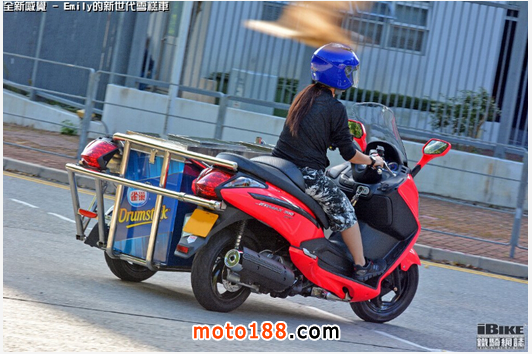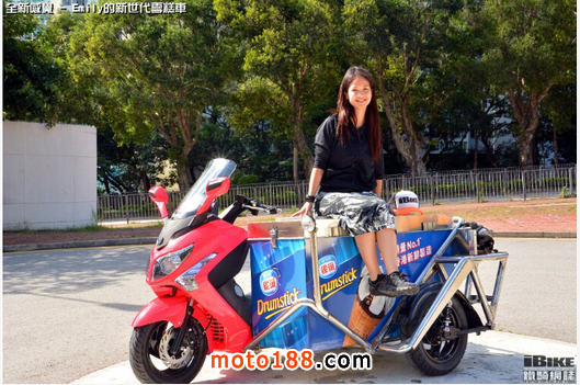 只要是香港人,一講起雪榚車,腦海馬上會聯(lián)想到兩種車:播著藍色多惱河音樂的軟雪榚車,和有一個巨形冰柜的三輪電單車。常見的三輪雪榚電單車,通常都是一位伯伯,開著偉士牌綿羊。所以當我們看見Emily開著她雪榚電單車時,簡直不敢相信自己的眼睛:賣雪榚的人,竟然由伯伯變?yōu)榻憬?。偉士手波鐵殼二沖綿羊,也變?yōu)槿朣YM Joymax 300i自動波綿羊,世界真的變了。