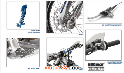 機(jī)器殼以精密的數(shù)控車床加工,還有WP 的 4CS前叉,輕了500克的WP尾避震和經(jīng)過(guò)改良的多連桿設(shè)計(jì),改善了懸掛系統(tǒng)的阻尼和平衡。確保在不過(guò)情況和地形上,都有最佳的牽引和控制。