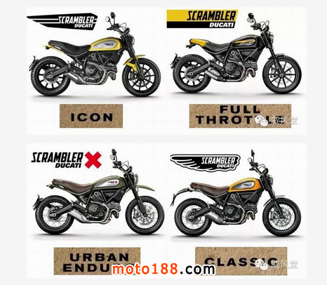 整個(gè)SCRAMBLER系列共有四款車,包括安排給傳媒駕駛的檸檬黃Icon、Urban Enduro(都市耐力爬雞)、Full Throttle(大開(kāi)油門)及Classic(古典),每款車均是配上相同的803cc風(fēng)冷四沖程L2Desmodromic 4汽門發(fā)動(dòng)機(jī)及鋼管車架,但車身細(xì)節(jié)及排氣管略有不同。
