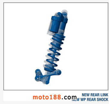 全新的WP尾避震比舊款輕量500g,全長縮短12mm,但行程增加3mm,備有比前更大容量的氮氣瓶,全吸震效果更上一層樓。
