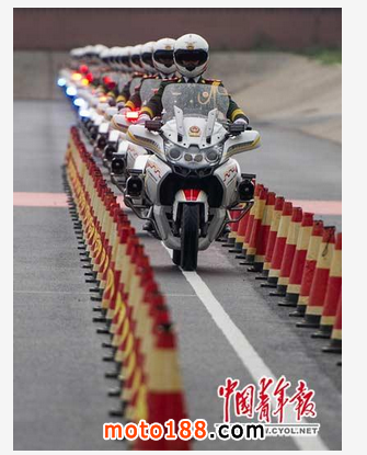 為了提高心理素質(zhì),摩托車禮賓護(hù)衛(wèi)隊(duì)在訓(xùn)練中加上了錐型帽作障礙物。
