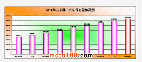 截至6月底,全國(guó)進(jìn)口機(jī)動(dòng)車保有量為7344378輛。其中,進(jìn)口汽車保有量7314783輛,與2014年底相比增加316817輛,增長(zhǎng)4.53%。與去年同期相比,增加716736輛,增長(zhǎng)10.86%,進(jìn)口汽車占進(jìn)口機(jī)動(dòng)車總量的99.6%,比去年同期提高0.01個(gè)百分點(diǎn)。進(jìn)口摩托車保有量為28487輛,比2014年底增加4764輛,比去年同期增加1917輛。從統(tǒng)計(jì)情況看,2011年以來(lái)進(jìn)口汽車特別是進(jìn)口小型載客汽車保有量呈快速增長(zhǎng)趨勢(shì),進(jìn)口汽車保有量占汽車保有量的比例達(dá)4.49%,比2011年底提高0.72個(gè)百分點(diǎn)。
