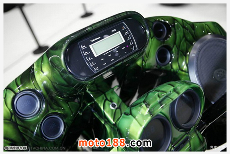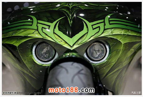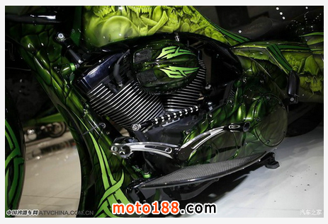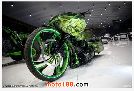 作為國(guó)際尖端休閑摩托車品牌,哈雷摩托車的生長(zhǎng)濃縮了自1903年美國(guó)一個(gè)世紀(jì)以來品牌的發(fā)展進(jìn)程,一代又一代的哈雷粉絲們被哈雷特有的氣質(zhì)所吸引。今日咱們的主角是一輛改裝過的哈雷,綠色骷髏的噴繪是該車最大的亮點(diǎn),夸大的外觀將暴力美學(xué)詮釋的酣暢淋漓。