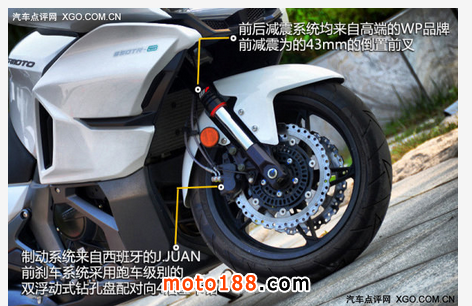 來自西班牙的J.JUAN制動(dòng)系統(tǒng),針對(duì)春風(fēng)650TR-G國(guó)賓車民用版的需求進(jìn)行特別調(diào)教,并配合同行業(yè)中頂級(jí)的德國(guó)大陸ABS防抱死制動(dòng)系統(tǒng),讓安全性得到了大幅提升。而業(yè)內(nèi)著名的WP倒立式可調(diào)前叉、后減震讓操控更加出色。