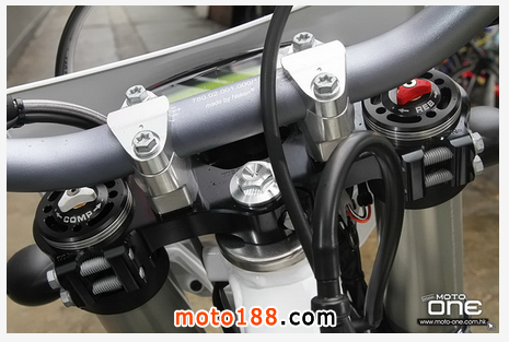 ●原裝車配備WP 48mm 4SC倒立前叉,采用流行的左右獨(dú)立調(diào)校,左為下壓,右為回彈,只須手動便可進(jìn)行調(diào)校,非常方便。