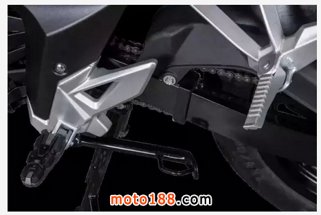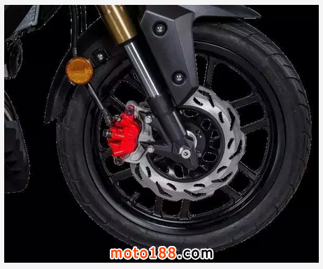 車輛前碟采用碟盤外徑276mm,后碟220mm,搭配高摩擦系數(shù)來另片,大大提高了車輛的穩(wěn)定性。后輪設計為120/80-17,比前輪設計尺寸略大,為了就是增加騎行的抓地力,讓動力輸出更穩(wěn)健。