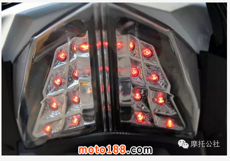 CK1-150的頭部和125造型和功能上都一樣,鹵素大燈加兩邊的LED眉燈。在大燈旁設(shè)置兩排LED眉燈似乎已經(jīng)成了光陽的傳統(tǒng),在今年上市的賽艇300上也有同樣的設(shè)計(jì)。與125不同,150的尾燈升級為16顆LED燈珠,造型和效果有明顯提升。