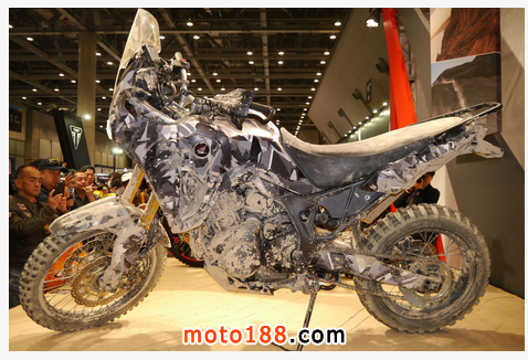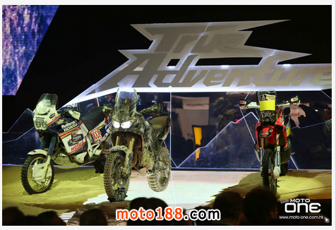 ●于2014年底舉行的意大利米蘭車展,HONDA展出了布滿泥濘CRF1000L Africa Twin原型車,旁為兩臺昔日及現(xiàn)役HONDA達(dá)卡戰(zhàn)車,Trun Adventure是形容新車是真正冒險車。