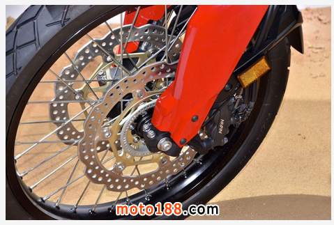 ●前掣動是Nissin 4活塞放射式卡鉗配310mm浮動菊花煞車碟,尾是256mm煞車碟配2活塞煞車卡鉗。近年流行採用前后17寸街車輪框的多用途冒險車不同,配備前后21 寸及18寸正宗越野輪框的Honda CRF1000L Africa Twin,是真正攀山涉水的冒險車。