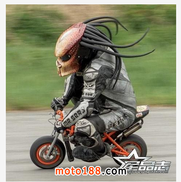 在《鐵血戰(zhàn)士》系列影視作品中,那個頭戴面具、身披鎧甲、手持矛槍、行動敏捷的遠古外星生物鐵血戰(zhàn)士(predators,英文原意為“捕食者”)給我們留下非常深刻的印象。鐵血戰(zhàn)士光顧地球與人類為敵,之后轉(zhuǎn)而又與異形(Alien)斗爭,這個角色一次次挑戰(zhàn)著觀眾的視覺極限,讓人們大呼過癮!如果有一天,你看到公路上有與鐵血戰(zhàn)士“相似”的騎士駕駛摩托飛奔,不要為此感到驚慌,這名騎士正是佩戴著Nitrinos推出的創(chuàng)意裝備——鐵血戰(zhàn)士頭盔。