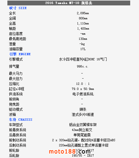自從MT-09獲得成功后,MT系列進(jìn)行快速繁殖,衍生出MT-125、MT-25、 MT-03、MT-07、MT-09 TRACER、MT-09 STREET RALLY及MT-09 SPORT TRACKER?,F(xiàn)在,公升級(jí)版正式面世,簡(jiǎn)單來(lái)說(shuō)MT-10是YZF-R1的NK版,因?yàn)橐?、?chē)架、尾擔(dān)、前叉及尾避震等都是移植自YZF-R1標(biāo)準(zhǔn) 版,有點(diǎn)像當(dāng)年FZS1000 Fazer的角色。