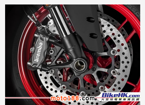 車架方面一如1299 Panigale,基本上只有鵝頸部份的單體式鋁合金車架,其余就以機械殼為受力點。車頭避震用上Showa的43mm BPF全調(diào)校式倒叉,車尾則是全調(diào)校式的單筒Sach避震。側(cè)置的設計令騎士易于調(diào)校。959 Panigale唯一跟家族成員有最大分別的,就是沒有采用底置的尾喉,而是采用出二設計,將兩支尾鼓都放在車身右邊。想用回底置喉及省去右側(cè)的出二?非歐盟四期排放版本就是了。而車重方面,959 Panigale的乾濕重都比1299 Panigale較重約10kg,意想不到了吧?