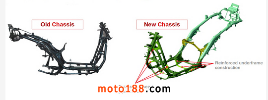 除了引擎動力和外觀, 車架也進(jìn)行了強(qiáng)化。與舊款G-DINK相比, 新款G-DINK在車頭前端采用較粗的鋼管,并在車身中央增加加強(qiáng)肋, 使得車身的抗扭轉(zhuǎn)能力更好