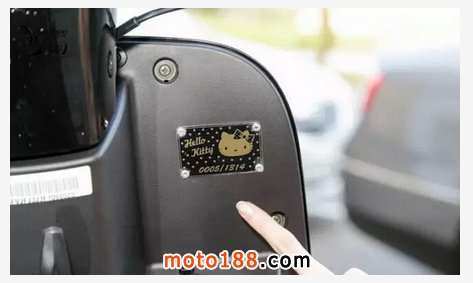 車身側(cè)邊以黑底圓點彩繪搭配大面積Kitty圖像,這要是騎在路上眾多妹妹都會多看一眼。