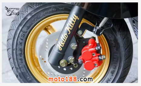 前輪框色調(diào)改為金色,前叉外管上印有Kitty字樣。
