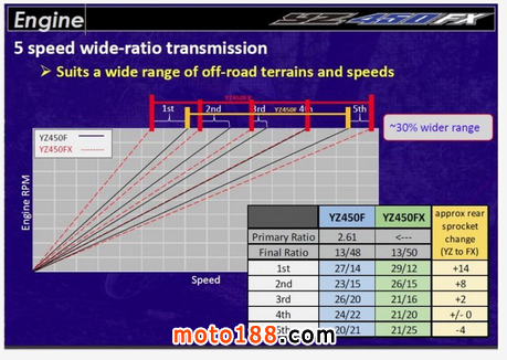 先來(lái)說(shuō)說(shuō)這臺(tái)449cc排量的發(fā)動(dòng)機(jī),YZ450FX的發(fā)動(dòng)機(jī)和YZ450F使用的是相同的水冷四沖程機(jī)器,同樣采用了鈦合金氣門,壓縮比也是相同的12.5:1,節(jié)氣門使用的也是Keihin 44mm規(guī)格。當(dāng)然作為一款定位更加激進(jìn)的場(chǎng)地越野車,雅馬哈還是對(duì)這臺(tái)發(fā)動(dòng)機(jī)進(jìn)行了一些升級(jí),比如更加方便的電啟動(dòng)系統(tǒng),當(dāng)然這一升級(jí)在外觀上的變化是幾乎難以察覺(jué)的。此外,F(xiàn)X車型的ECU也進(jìn)行了重新調(diào)校,除了保證電器系統(tǒng)的正常工作之外還有了不同風(fēng)格的動(dòng)力輸出。值得注意的是,雅馬哈也會(huì)將這套ECU程序單獨(dú)出售給WR450F車主,想必這也是后者正需要的。
