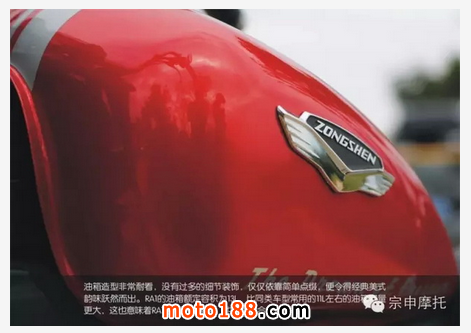 油箱造型非常耐看,沒有過多的細(xì)節(jié)裝飾,僅僅依靠簡單點(diǎn)綴,便令得經(jīng)典美式韻味躍然而出。RA1的油箱額定容積為13L,比同類車型常用的11L左右的油箱容量更大,這也意味著RA1續(xù)航更加持久,也更加適合長途騎行。