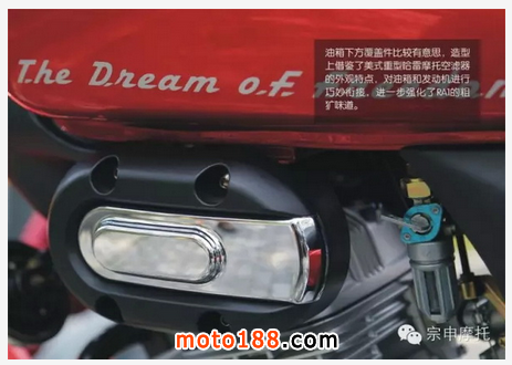 油箱下方覆蓋件比較有意思,造型上借鑒了美式重型哈雷摩托空濾器的外觀特點(diǎn),對油箱和發(fā)動機(jī)進(jìn)行巧妙銜接,進(jìn)一步強(qiáng)化了RA1的粗獷味道。