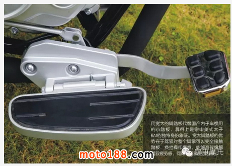用寬大的腳踏板代替國產(chǎn)內(nèi)子車慣用的小踏板,算得上是宗申美式太子RA1的獨(dú)特身份象征。寬大腳踏板的優(yōu)勢在于駕馭時(shí)整個(gè)腳掌可以完全接觸踏板,換擋操作愜意,能夠有效緩解駕馭疲勞感,同時(shí)令駕姿更加舒展。