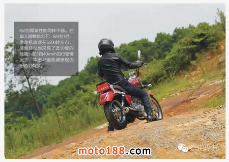 RA1的爬坡性能同樣不錯(cuò)。在單人騎乘狀態(tài)下,RA1掛1擋,發(fā)動機(jī)轉(zhuǎn)速在5500轉(zhuǎn)左右,非常輕松地攻克了近30度的陡坡;在5擋40km/h的行駛情況下,沖擊45度陡坡表現(xiàn)仍舊游刃有余。