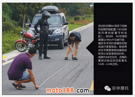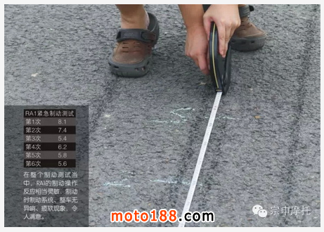 RA1采用了經(jīng)典的前碟后鼓配置(RA1也有前后碟剎配置可供選配)。測試時(shí),RA1在常規(guī)路面以40km/h勻速行駛,車手在測試中同時(shí)緊握前后制動進(jìn)行緊急制動。除前兩次車手需要熟悉地面制動標(biāo)志以及緊急制動時(shí)機(jī),成績?yōu)?米左右外,后期反復(fù)測試制動安定距離在5.6米~6.4米之間。