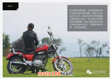 RA1在設(shè)計(jì)上肯定考慮到了國內(nèi)摩托車愛好者的身材,在整車尺寸上以肯定是以亞洲人身材為設(shè)計(jì)核心,對于國內(nèi)絕大多數(shù)車迷來說絕對適合。