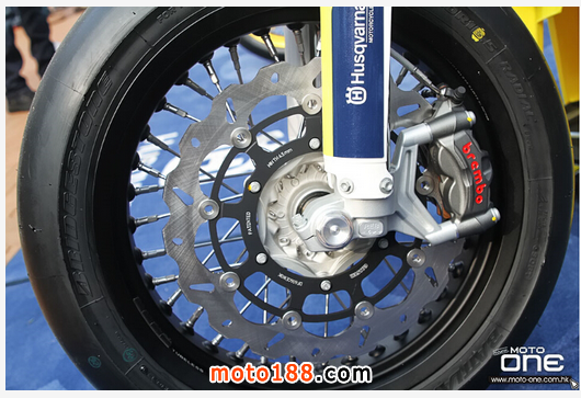 跟其他Husqvarna型號(hào)相同,Husqvarna FS450同樣配備WP前后避震,前為48mm倒立前叉,備有全調(diào)校功能,尾是擁有拖樽的全調(diào)校單筒避震,其行程及吸震性能是專為FS450這類SUPERMOTO車型重新調(diào)校。而夾緊一對(duì)倒立前叉的上下眼鏡是由CNC電腦砌割而成,其高剛性在極端煞車情況下提供極佳的支撐功能。而車頭及車尾均是配備輕量化的合金鋼絲前16.5寸、后17寸輪框,原裝車已備有BRIDGESTONE的 125/80 R420、165/65 R420 SUPERMOTO專用賽車輪胎。