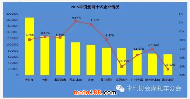 2015名銷量前十名企業(yè)分別是大長江、力帆、隆鑫、五羊本田、宗申、銀翔、洛北方、大運(yùn)、新大洲本田、重慶建設(shè)。銷量前十名企業(yè)中僅五羊本田呈現(xiàn)微幅上漲,其他企業(yè)呈現(xiàn)不同程度下降,個別企業(yè)降幅超過了25%。