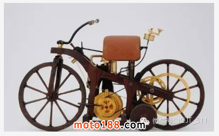 原始摩托車(chē),現(xiàn)存于德國(guó)慕尼黑科學(xué)技術(shù)博物館的真實(shí)造型,是德國(guó)人(注意:還是德國(guó)人)戈特利布·戴姆勒和他的助手邁巴赫(就是這哥倆)于1885年8月29日獲得專利發(fā)明優(yōu)先權(quán)的世界上第一輛摩托車(chē)。他們?cè)斐鲆慌_(tái)氣冷二沖程垂直單缸、以汽油為燃料的內(nèi)燃機(jī)。兩人把這臺(tái)發(fā)動(dòng)機(jī)安裝在以橡木為車(chē)架的單車(chē)上,世界上第一輛摩托車(chē)也隨之誕生了。該車(chē)后輪26寸,采用皮帶傳動(dòng)加一級(jí)齒輪變速,最快時(shí)速11.2公里/小時(shí)。