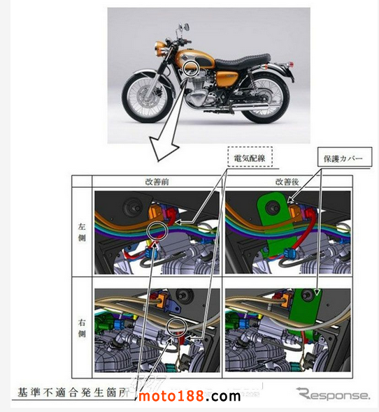 川崎W800存在的兩個問題都會導(dǎo)致發(fā)動機運轉(zhuǎn)異常,一個是因電線安裝不當(dāng),可能會使電線卡在油箱與車架的縫隙中,造成電線損壞,如果裸線與油箱接觸會引起短路,進而導(dǎo)致發(fā)動機停滯。為此,川崎經(jīng)銷商將為車主加裝電線防護罩,并重新安排電線的位置。