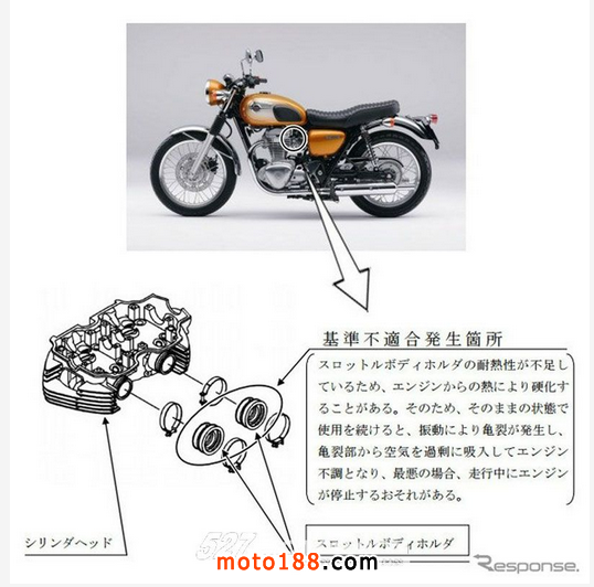 近期,關(guān)于各大摩托車廠家的召回信息層出不窮,本田、鈴木、KTM、 BMW等品牌都有召回信息公布。此次川崎也因電線和節(jié)氣門問題導(dǎo)致的發(fā)動機運轉(zhuǎn)異常發(fā)布了召回信息,宣布召回5973臺生產(chǎn)日期在2010年12月17日-2015年12月4日的W800車型。