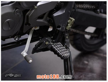 橡膠材質(zhì)的前腳踏,雖然沒有專業(yè)越野摩托車的金屬質(zhì)感,但是實(shí)際踩上去,感覺還是不錯(cuò)的,并沒有想象中的那么單薄。