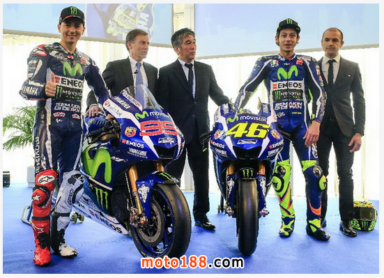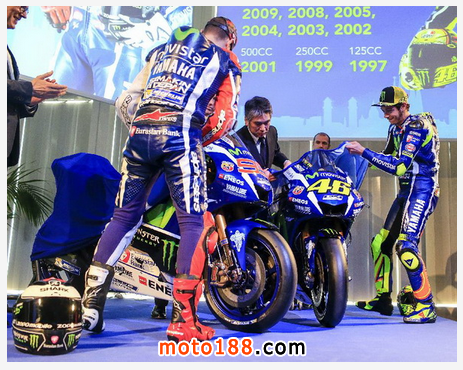 意大利車手瓦倫蒂諾·羅西(右一)和西班牙車手豪爾赫·洛倫佐(左二)在新車發(fā)布會上為新車揭幕。 當日,雅馬哈車隊在西班牙巴塞羅那召開新聞發(fā)布會,車手羅西與洛倫佐共同為新款賽車揭幕。