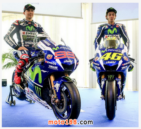 意大利車手瓦倫蒂諾·羅西(右)和西班牙車手豪爾赫·洛倫佐在新車發(fā)布會上。 當日,雅馬哈車隊在西班牙巴塞羅那召開新聞發(fā)布會,車手羅西與洛倫佐共同為新款賽車揭幕。