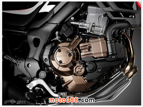這臺排量達(dá)998毫升的并列雙缸發(fā)動機汲取了CRF450R和CBR1000RR的精華。采用了本田Unicam技術(shù)的單頂置凸輪軸直接驅(qū)動進氣門,排氣門則通過搖臂驅(qū)動,凸輪軸使用了與CBR1000RR相同的材質(zhì),此舉令缸頭尺寸更加小巧。本田還把水泵置于變速箱殼體內(nèi),同時使用發(fā)動機內(nèi)置的平衡軸來直接驅(qū)動水泵與機油泵。緊湊的設(shè)計令重心降低,同時提高了離地間隙,增強了野外適應(yīng)能力。每缸采用雙火花塞保證燃燒充分,提高動力的同時降低了油耗。270度曲軸確保了動力的流暢輸出,并增強了越野路面的牽引能力。發(fā)動機還提供4級設(shè)置的HSTC系統(tǒng),可從車把上直接控制輸出扭矩曲線。