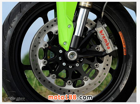制動(dòng)系統(tǒng)采用前320毫米雙鉆孔盤配Brembo對(duì)向4活塞直栓式卡鉗、后220毫米單鉆孔盤配對(duì)向雙活塞卡鉗,如此的配置對(duì)于高達(dá)260公斤的車重是完全必要的。實(shí)際的試駕中前后制動(dòng)系統(tǒng)都感覺完全稱職。量產(chǎn)車還標(biāo)配了博世的ABS防抱死制動(dòng)系統(tǒng)。