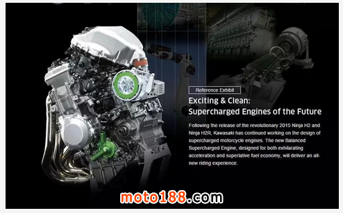 KAWASAKI在2013年日本東京車展展出機械增壓的并列四缸發(fā)動機后,使外界期待大作的面世。幸好,KAWASAKI并沒有讓車迷失望,在2014年9月30日正式發(fā)布配上機械增壓發(fā)動機的H2及H2R。在2015年的東京車展上,KAWASAKI展出一臺名為KAWASAKI Balanced Supercharged Engine Concept的概念發(fā)動機,驟眼看與H2及H2R的四缸發(fā)動機分別不大,細(xì)心看官方的簡短介紹影像才發(fā)現(xiàn)在機械增壓部位增加了類似搖臂的機件,作用是控制扇葉的開啟角度,即是說電腦根據(jù)車速及轉(zhuǎn)數(shù)等數(shù)據(jù),控制機械增壓的入風(fēng)量及流速,以達(dá)到KAWASAKI描述發(fā)揮發(fā)動機最大效率同時,也可做到省油,這功能與可變氣門有異曲同功之妙,可是廠方?jīng)]有公布新發(fā)動機的排氣量及細(xì)節(jié)。