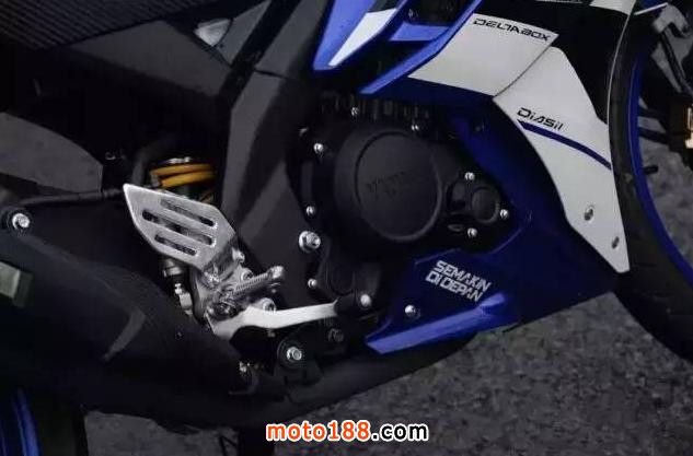 R15采用鉆石型車架、全新鋁合金后搖臂和增寬的新輪胎,軸距由1290加至1345mm,五柱式合金輪圈與合金尾搖臂提升了R15 高速穩(wěn)定性和轉(zhuǎn)向能力;前胎由80/90-17改城90/80-17,后胎由100/80-17增至130/70-17。如此設(shè)定使R15的操控更加扎實(shí),也提升了彎道中的駕駛性能。