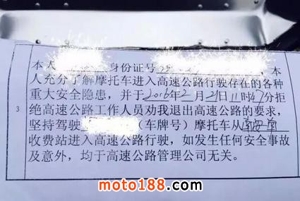 2016年2月21日中午時(shí)分,福建三明一車友在裝備齊整,證件檢查無誤后單人駕駛著自己的摩托車由南安南(路口)前往永安南(路口)。為爭(zhēng)取全國(guó)摩友合法上高速的權(quán)利以及驗(yàn)證高速職權(quán)部門的“平等 真相 正義”(小編YY中),車友毅然決定:親自一探高速公路究竟。在【南安南】高速路口取卡 上路。此時(shí),一路政人員前來詢問其取卡事由,在表明立場(chǎng)并據(jù)理力爭(zhēng)后,工作人員終拿出了如下圖所示的官方“免責(zé)聲明”,在車友確認(rèn)簽字后給予放行,并收回高速繳費(fèi)卡。