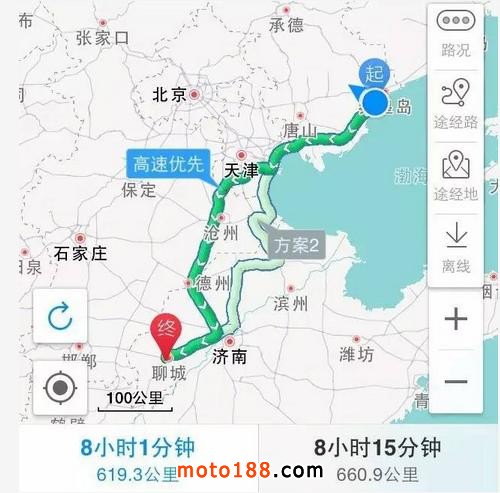 換卡、交費(fèi),繼續(xù)趕路,雖然55元的過路費(fèi)有點(diǎn)心疼,不過我心底也是高興的,因?yàn)槲艺W咴诹宋覒?yīng)該走的高速上。我知道我有這樣心態(tài)的原因是咱們的摩托車政策執(zhí)行還不規(guī)范,不過我相信情況會越來越好。到達(dá)德州服務(wù)區(qū)后車正好沒油,加油,稍做調(diào)整。隨著天已經(jīng)慢慢變黑,我也逐漸降速。心想到達(dá)濟(jì)南就不走了,住一晚明天繼續(xù)。   到濟(jì)南的時候18點(diǎn)了,天黑了、氣溫下降,身體開始感覺冷了,尤其是手和腳脖子,有些念頭打算下高速住宿??纯碐PS距離家還剩150公里,于是決定繼續(xù)走,七點(diǎn)半下高速到達(dá)聊城,八點(diǎn)回到家,全程776公里。