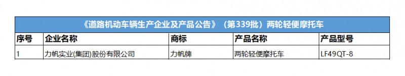 第339批公示兩輪輕便摩托車品牌包括:力帆牌,能上牌的1款產(chǎn)品型號見圖2。
